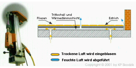 | Austrocknung des schwimmenden Estrich über die Geschossdecke: Bei dieser Technik werden mittels eines Diamantkernbohrgerätes Einblasöffnungen für die trockene Luft von unten durch die Betondecke gebohrt. Oberbeläge bleiben erhalten, Betriebsabläufe, sowie Wohnqualität werden nicht störend beeinflusst. |